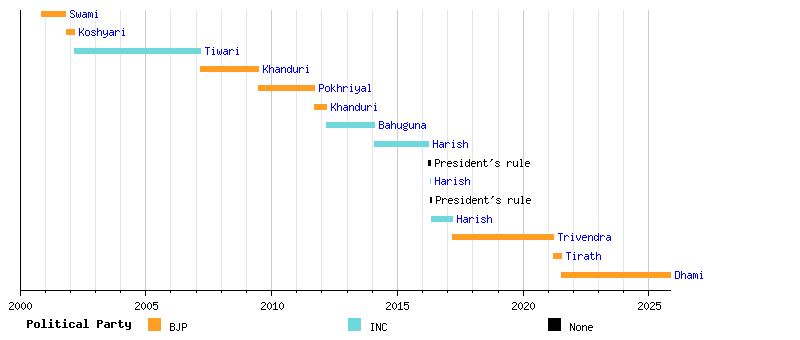 Ten people have served as the state's chief minister since its formation on 9 November 2000. Seven of them, including the inaugural officeholder Nityanand Swami and the incumbent Pushkar Singh Dhami represented the (BJP) while the rest represented the Indian National Congress.