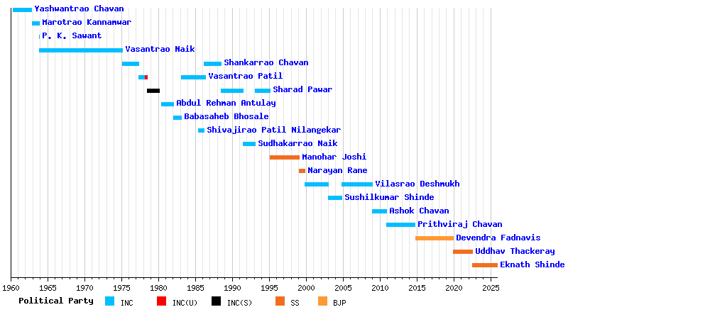 Maharashtra was formed by dissolution of Bombay State and Hyderabad State on 1 May 1960.[3] Yashwantrao Chavan, who was serving as the third CM of Bombay State since 1956, became the first CM of Maharashtra. He belonged to the Indian National Congress and held the office until the 1962 Assembly elections. Marotrao Kannamwar succeeded him and was the only CM to die while in office.[4][5] Vasantrao Naik, who was in office from December 1963 to February 1975 for more than 11 years, has by far been the longest serving CM. He also was the first and only CM to complete his full term of five years (1967-1972) till Devendra Fadnavis matched it (2014-2019). With the exceptions of Manohar Joshi (SS), Narayan Rane (SS), Devendra Fadnavis (BJP), Uddhav Thackeray (SS) and Eknath Shinde (SS), all other CMs have been from the Congress or its breakaway parties.[6][7][8]