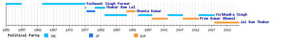 | 6 | Jai Ram Thakur | Seraj | 27 December 2017 | Incumbent | 7 years, 306 days | 13th Assembly | Bharatiya Janata Party | ||