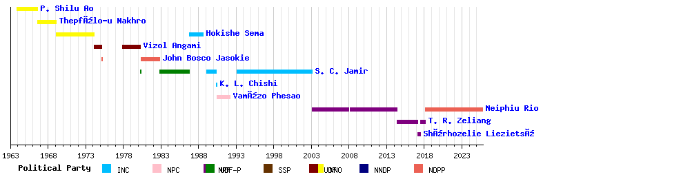 Since 1963, eleven people belonging to seven parties have served as Chief Minister of Nagaland. The first three belonged to the Naga Nationalist Organisation, including the inaugural officeholder P. Shilu Ao. The current incumbent is Neiphiu Rio of the Nationalist Democratic Progressive Party, in office since 8 March 2018.