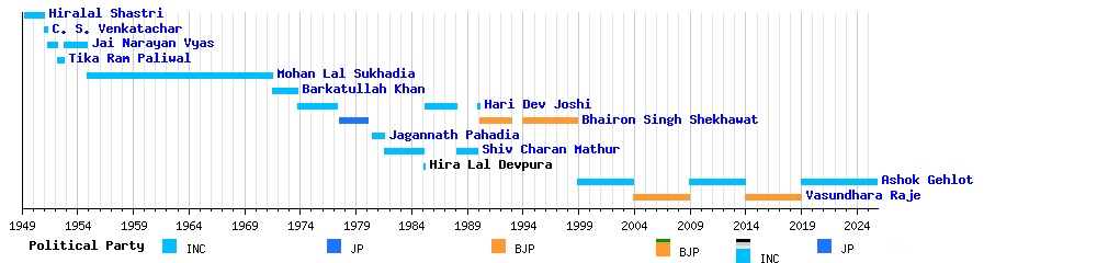From 1949, 13 people have been Chief Minister of Rajasthan. Vasundhara Raje Scindia of the Bharatiya Janata Party is only female to serve as the chief minister of the state. After securing majority in 2018 assembly election, Ashok Gehlot of the Indian National Congress assumed office on 17 December 2018.