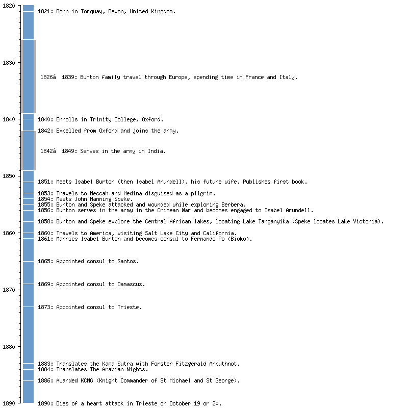 Burton was a captain in the army of the East India Company, serving in India, and later briefly in the Crimean War. Following this, he was engaged by the Royal Geographical Society to explore the east coast of Africa, where he led an expedition guided by locals and was the first European known to have seen Lake Tanganyika. In later life, he served as British consul in Fernando Pó (now Bioko, Equatorial Guinea), Santos in Brazil, Damascus (now Syria), and finally in Trieste (now Italy).[4] He was a Fellow of the Royal Geographical Society and was awarded a knighthood in 1886.[5]